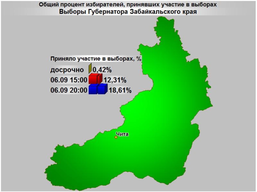 Избирательная комиссия Забайкальского края сообщила, что по состоянию на 20.00 6 сентября свой выбор сделали 141 тысяча 518 жителей края. Явка составила 18,61% избирателей.