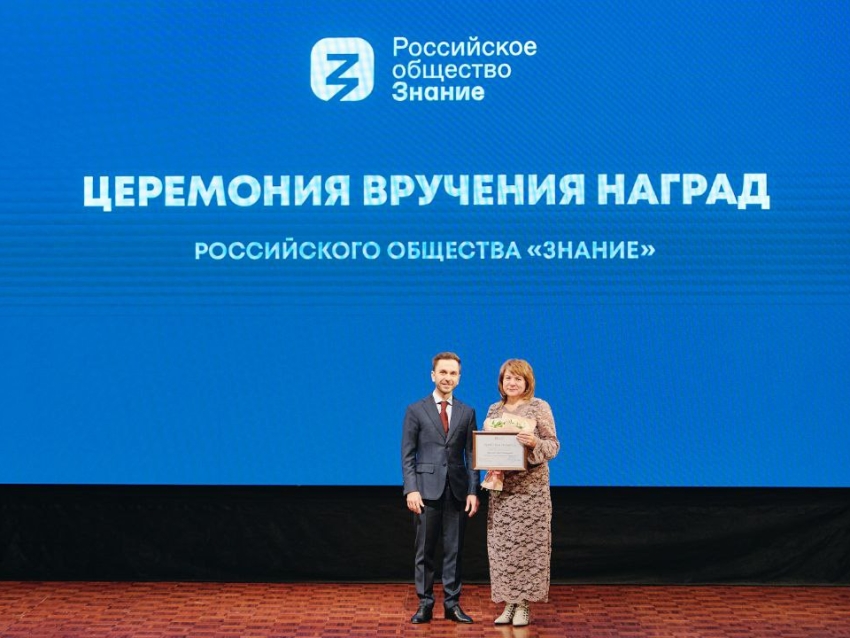 Генеральный директор Российского общества «Знание» Максим Древаль наградил Почетной грамотой директора филиала Российского общества «Знание» в Забайкальском крае Ирину Грешилову.