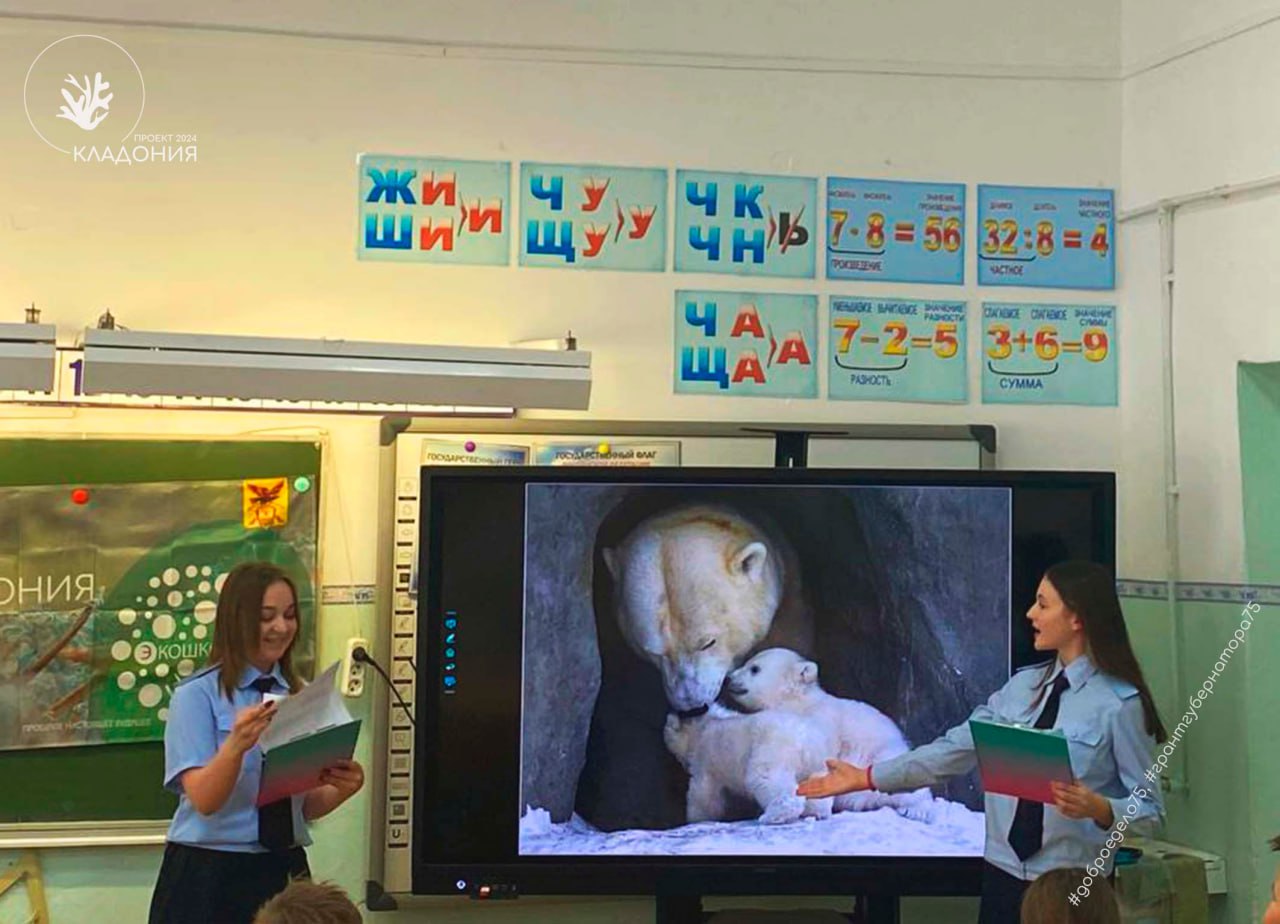 Команда некоммерческой организации «Экошкола» проекта «Кладония» в очередной раз увлекла школьников работой на площадках, где обсуждаются экологические вопросы. Волонтеры – студентки Забайкальского института предпринимательства разработали и провели занятия для детей начальной школы «День белого мишки».