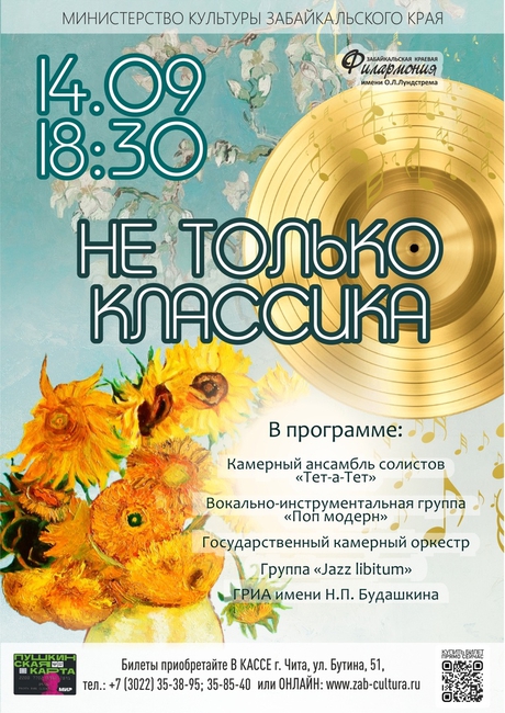 14 сентября в 18:30 на сцене большого концертного зала состоится традиционное открытие концертного сезона. В этом году артисты филармонии подготовили для забайкальских зрителей концертную программу «Не только классика». Зрители смогут познать 25 уроков счастья, раскрывающихся в шедеврах мирового искусства.