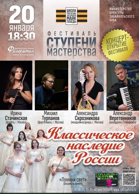 20 января в 18:30 концерт «Классическое наследие России». Вас ждёт программа из творчества русских и советских композиторов. Вы услышите произведения: Сергея Рахманинова, Георгия Свиридова, Альфреда Шнитке, Дениса Хорова, Михаила Глинки, Петра Чайковского, народные песни и любимые мелодии в изысканной обработке для флейты, домры, мандолины, аккордеона и фортепиано.