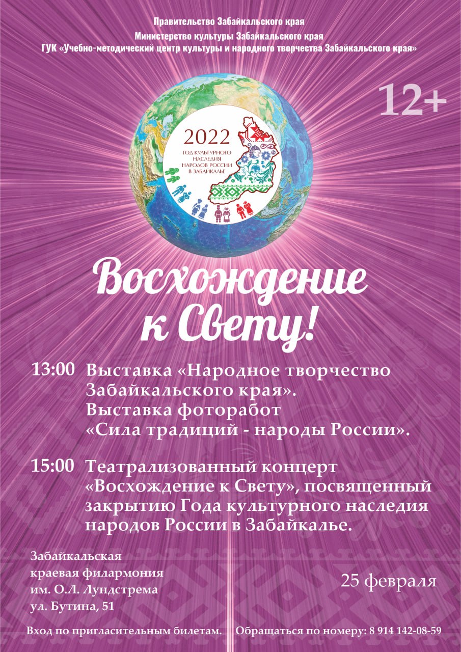 Напомним, Год культурного наследия народов России в Zабайкалье открылся театрализованным концертом «Свет и радость творения!» в краевой филармонии имени Олега Лундстрема в марте 2022 года.