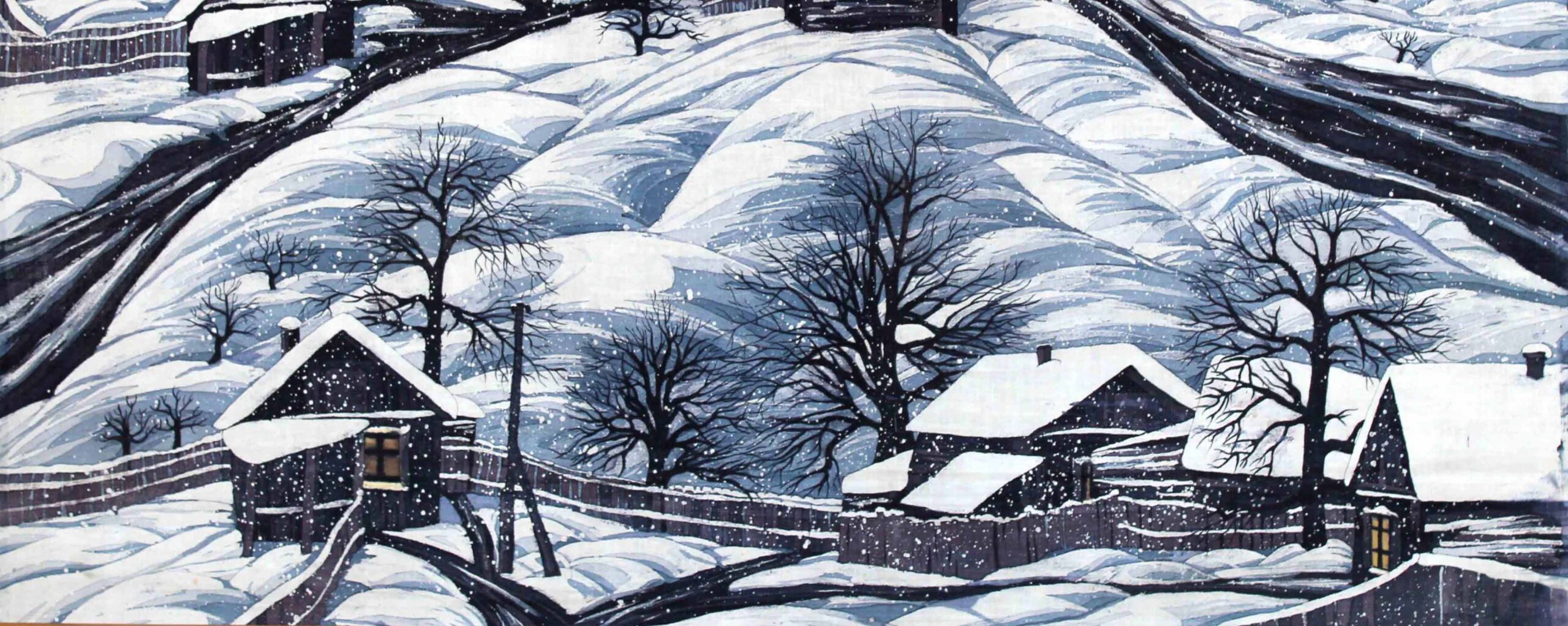 Волшебный мир зимы, описанный в стихотворении Ларисы Кузьминской, точно сочетается с картиной «Спят снега» Елены Петровой из коллекции художественного музея. Яркий деревенский вечерний пейзаж с падающим, сказочно парящим снегом на фоне ночного неба создаёт потаённый мир зимней сказки.