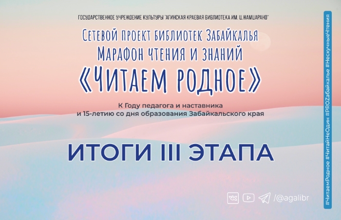 Уважаемые читатели! Агинская краевая библиотека им. Ц.Жамцарано подвела итоги заключительного III этапа марафона чтения «Читаем родное» сетевого проекта библиотек Забайкалья «В гостях у детских писателей Забайкалья»,