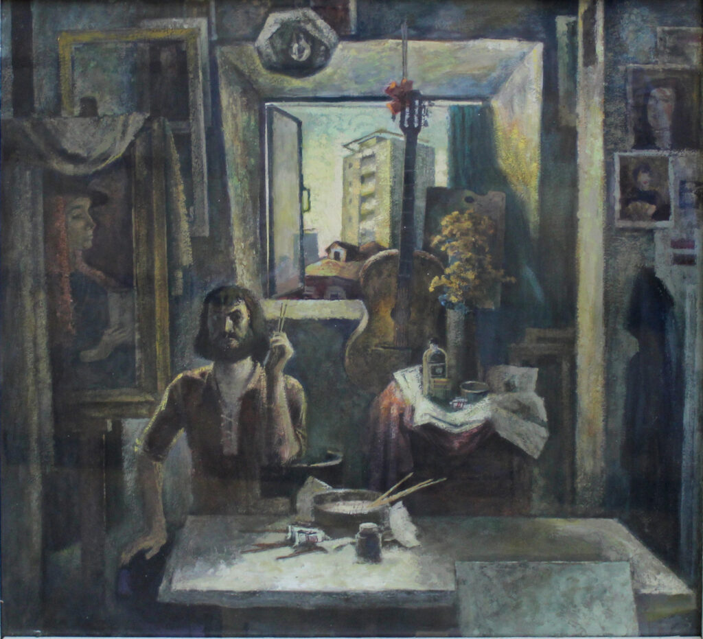 Приверженец «сурового» стиля в изобразительном искусстве Сергей Прудников старался своими картинами передать зрителю сущность профессии художника через автопортреты.