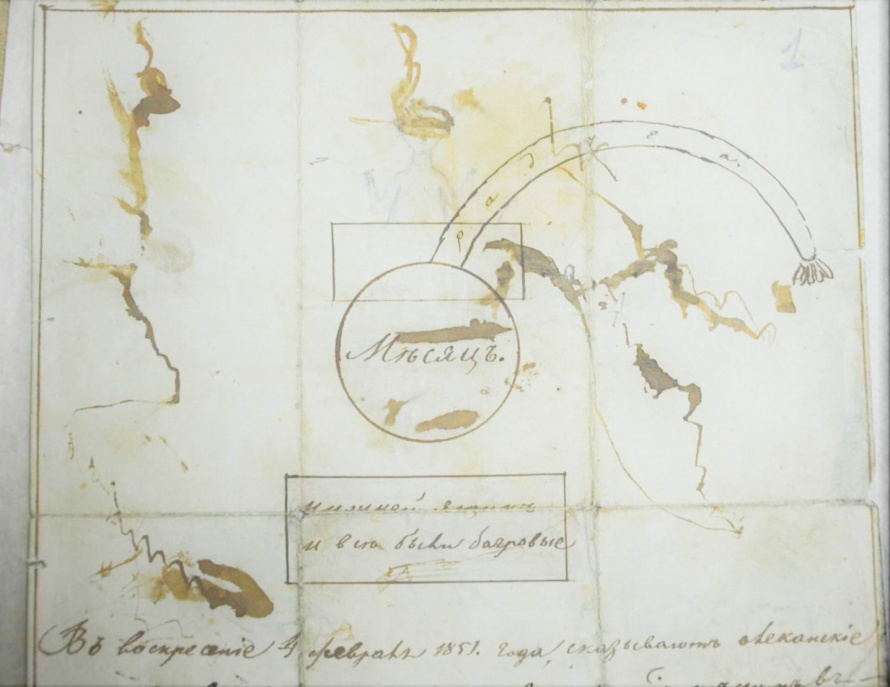 «В воскресенье 4 февраля 1851 года, сказывают Олеканские жители, видели повечеру, когда взошел месяц, и с ним вместе показывалось небесное явление в багровом виде, примерно сделанному рисунку, т. е. вверху и внизу в виде ящиков. На верхнем [ящике] изображался человек с ушами [?] и руками, держащими загнутыми вверх. Затем человек исчез, появилось от месяца и верхнего ящика [нечто] подобно небольшой радуге, при конце [которой] показывалась кисть. После всё это исчезло в короткое время, и месяц сделался обыкновенно светлым».