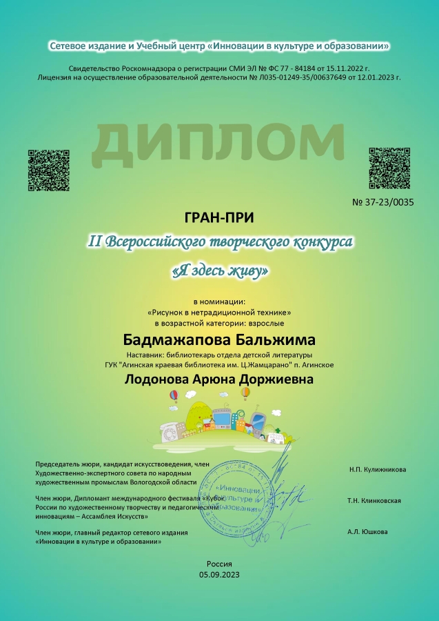 В творческом конкурсе «Я здесь живу» сетевого издания «Инновации в культуре и образовании», поддержанный учебным центром «Инновации в культуре и образовании» приняла участие библиотекарь Агинской краевой библиотеки им.Ц.Жамцарано» Лодонова Арюна Доржиевна в качестве наставника Бадмажаповой Бальжимы, талантливой девушки. Хотя она не говорит и не ходит, у нее необыкновенный талант — пальцами ног Бальжима создает удивительные картины: природу, людей, животных. Она видит, чувствует и слышит то, что другие не замечают, её картины излучают все краски жизни и удивительную доброту. Она радуется жизни, её картины и стихи, которые она пишет, очень вдохновляют и заставляют других людей любить и ценить жизнь. Бальжима завоевала Гран-При конкурса! Её конкурсная работа порадовала всех высоким качеством и оригинальностью, участница проявили немалое старание, мастерство и настоящую творческую фантазию при работе над своими произведениями.