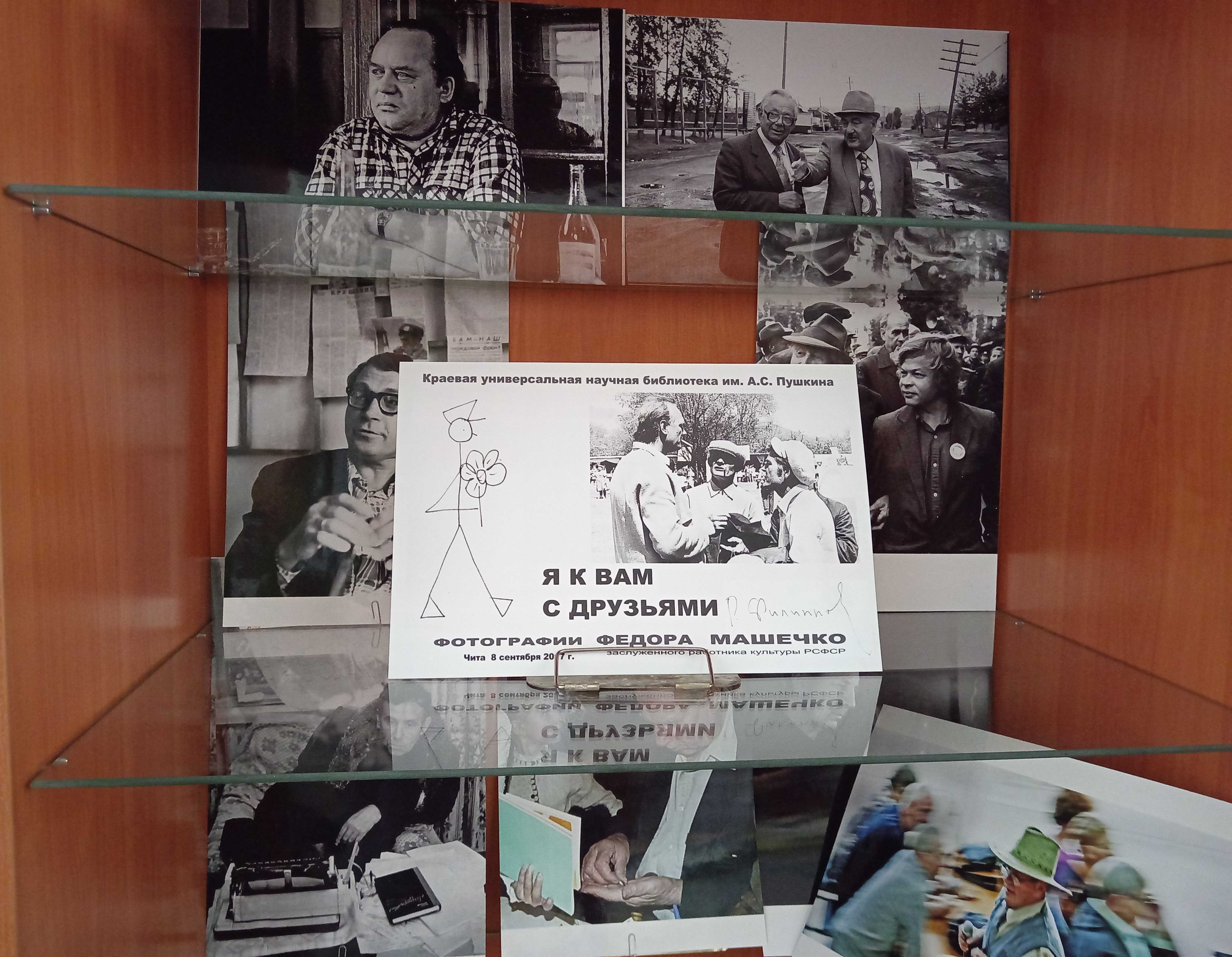 Слова из стихотворения Ростислава Филиппова не случайно стали названием выставки «Я к вам с друзьями…», приуроченной к 50-летию Литературного музея Забайкалья в краевой научной библиотеке им. А. С. Пушкина, которая состоялась в период проведения литературного праздника «Забайкальская осень – 2017». Литературные праздники в 1960-70-е годы проходили с большим успехом, приезжали именитые гости, такие как, Булат Окуджава, Леонид Соболев, Антонина Коптяева и другие. Творческие встречи встречи проходили в Пушкинской библиотеке и в драмтеатре. Многолюдным и оживленным был книжный базар на центральной площади города. Федору Николаевичу удалось не просто «задокументировать» эти исторические события, но и запечатлеть их участников в непринужденной обстановке. В работах Машечко широко представлены фотопортреты забайкальских поэтов и прозаиков: Николай Ященко, Василий Балябин, Владислав Ляхницкий, Григорий Кобяков, Георгий Граубин, Евгений Куренной, Михаил Вишняков, Борис Макаров, Николай Кузаков и другие. Фотографии, представленные на фотовыставке были подарены Литературному музею самим автором. На них запечатлены поэты и писатели, музыканты, артисты и художники – все те, с кем по роду своей деятельности пришлось работать и дружить Федору Машечко.