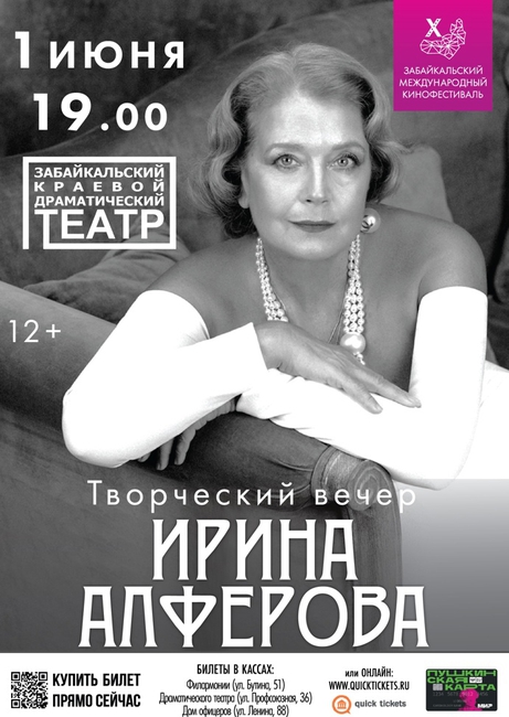 В рамках Х Забайкальского Международного кинофестиваля на сцене Забайкальского краевого драматического театра пройдет творческий вечер народной артистки России Ирины Алфёровой.