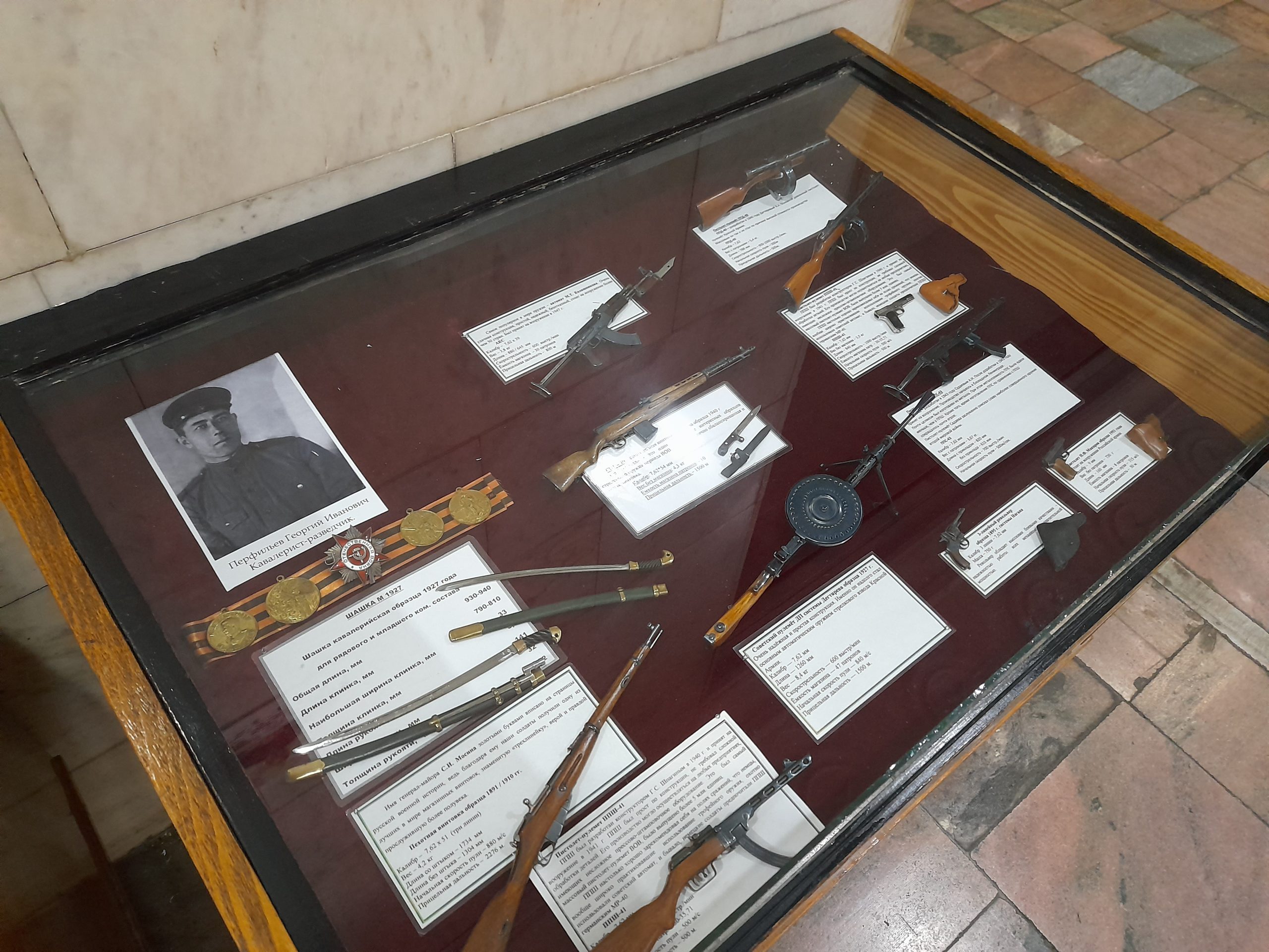 На выставке в Военно-историческом музее Дома офицеров представлены копии шашек, пистолетов, револьверов, автоматов и пулемётов.