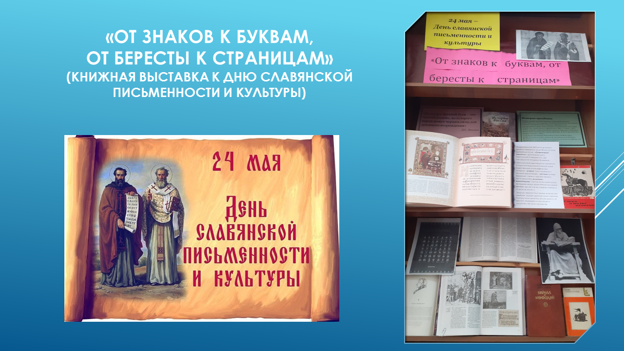 24 мая мы отмечаем День славянской письменности и культуры. Это праздник просвещения, культуры, родного слова. В читальном зале библиотеки ЧИ БГУ к этому событию подготовлена книжная выставка «От знаков к буквам, от бересты к страницам».