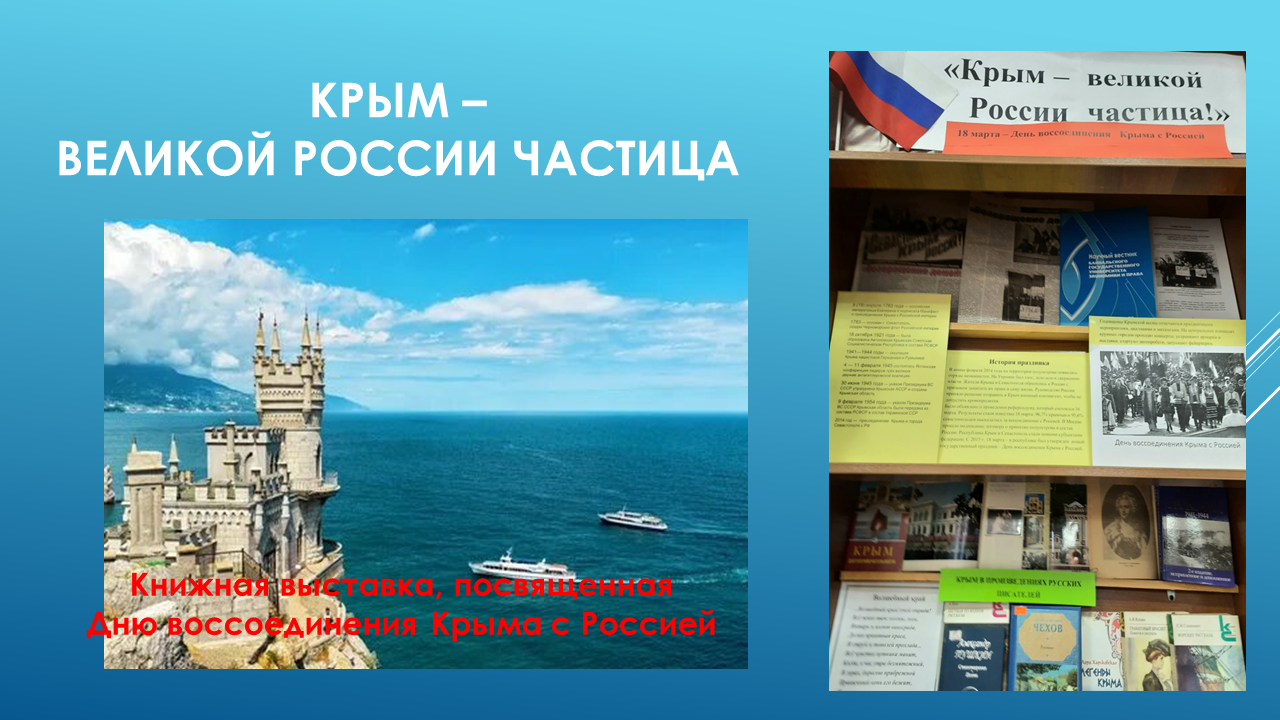 Книжно-иллюстративная выставка «Крым – великой России частица», представленная в читальном зале библиотеки, содержит сведения об исторических и политических событиях, происходивших на полуострове, материалы о памятниках архитектуры, красивейшей природе Крыма.