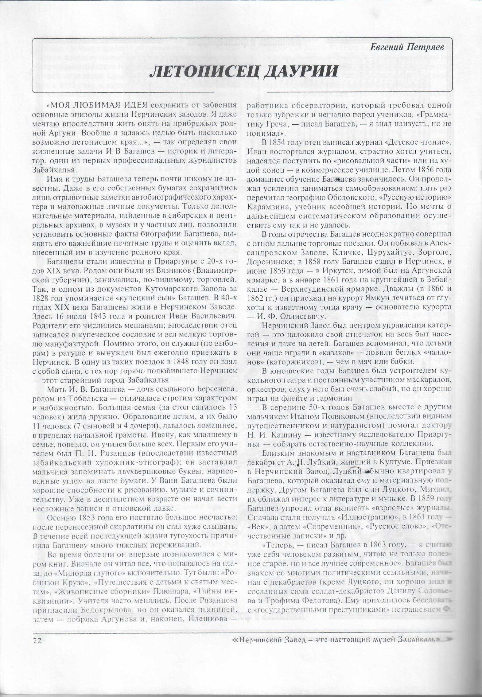 «Моя любимая идея сохранить от забвения основные эпизоды жизни Нерчинских заводов. Я даже мечтаю впоследствии жить опять на прибрежьях родной Аргуни. Вообще я задаюсь целью быть насколько возможно летописцем края…» И. В. Багашев.