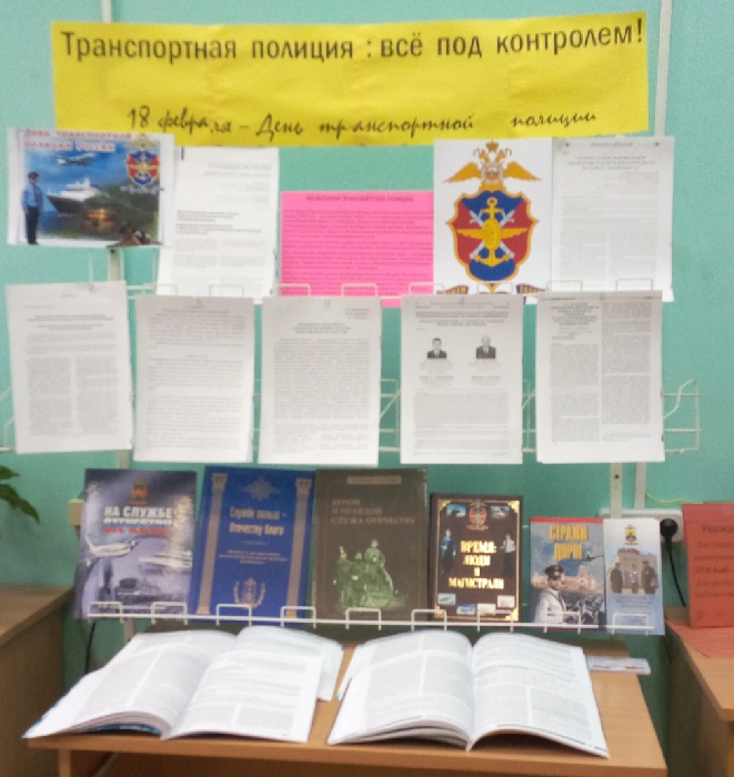 Отсчёт времени деятельности транспортной полиции принято вести от 18 февраля 1919 года – дня принятия Декрета ВЦИК «Об организации железнодорожной милиции и железнодорожной охраны». Транспортной милиции вменялись в обязанности борьба с преступностью и оборона в случаях нападения, контроль за уборкой подвижного состава и очисткой железнодорожных путей. На выставке представлен ряд статей из периодики об истории создания транспортной полиции в России, о преступности на транспорте, современном положении дел и проблемах в этой структуре полиции. Несколько книг для выставки нам любезно предоставила библиотека Линейного Управления МВД на транспорте. Например, «На службе Отечеству: История организации и обеспечения правопорядка на транспорте России», «Время: люди и магистрали», в которой читатель найдёт интереснейшие очерки о раскрытии некоторых резонансных преступлений за период с 19 века до сегодняшних дней. О работе Забайкальской транспортной полиции рассказывает книга «Службе польза – Отечеству благо». В ней всё: история, структура отделов, кадры, общественная и спортивная жизнь.