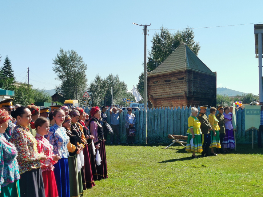 В конце церемонии открытия главы сёл, из которых приехали участники: Мангута, Верхнего Ульхуна, Алтана вместе с главой принимающего фестиваль села Кыра Дмитрием Щербяком под гимн России подняли флаг страны.