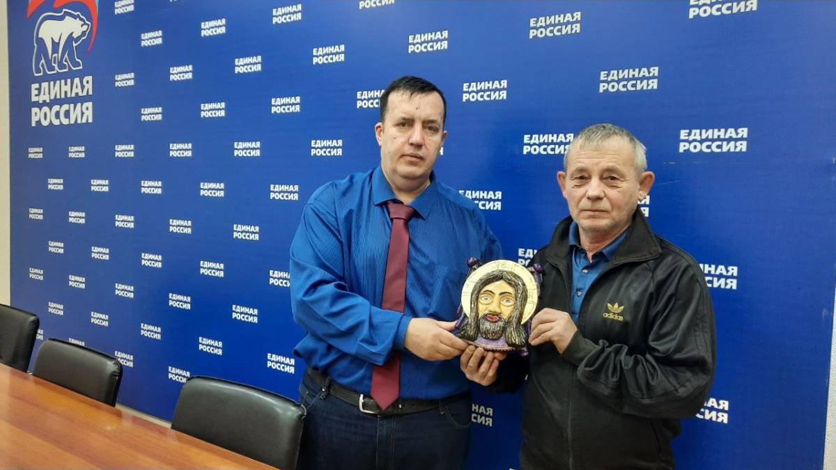 Источник фото: пресс-служба Забайкальского регионального отделения "ЕР" Забайкалец Михаил Григорьев передал представителям Регионального исполнительного комитета партии «Единая Россия» собственноручно вырезанную из дерев
