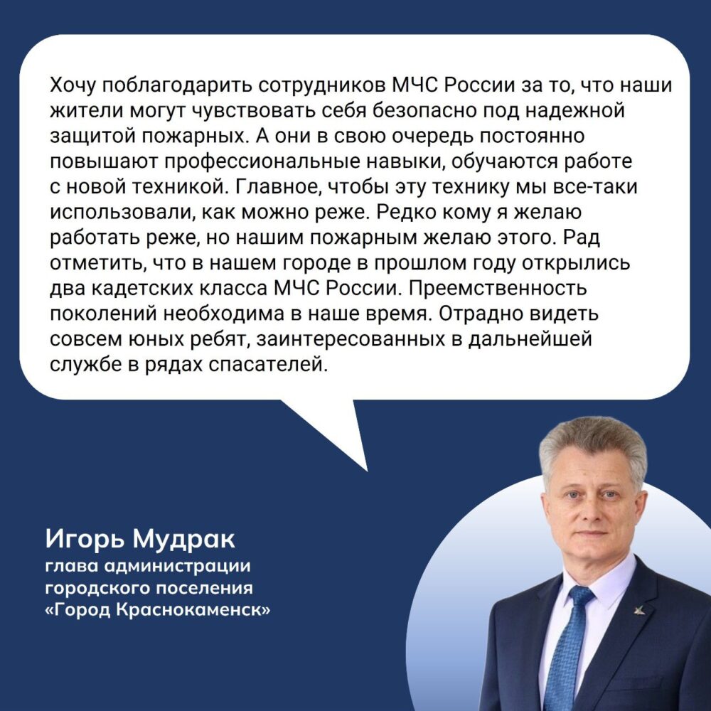 Глава Краснокаменска Игорь Мудрак выступил с приветственным словом на торжественном вручении новых пожарных автомобилей