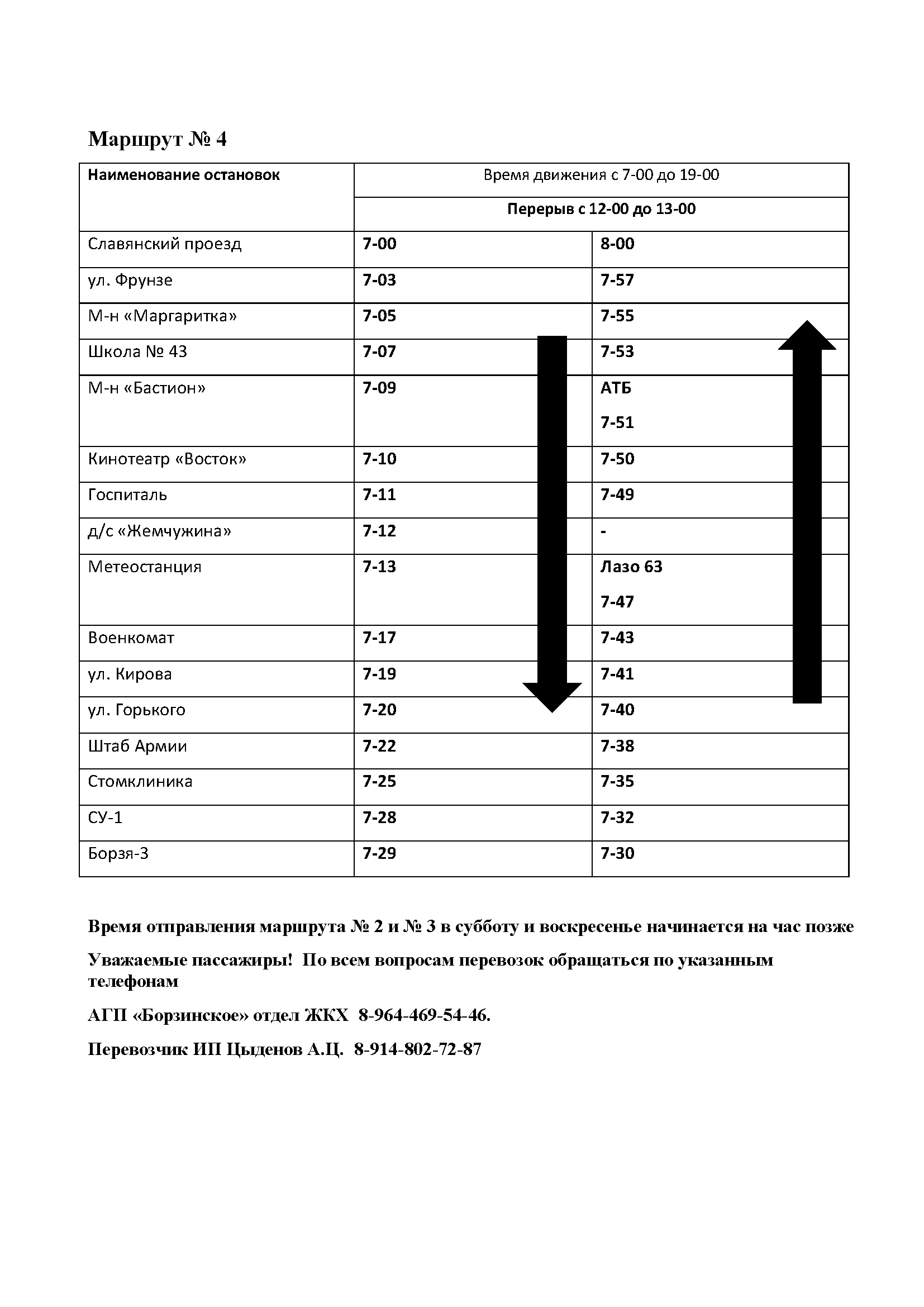 Относительно выходных дней: автобус маршрута №1 в выходные не ходит, маршрут № 4 ходит, как обычно, автобусы маршрутов №2 и №3 ходят на час позже.