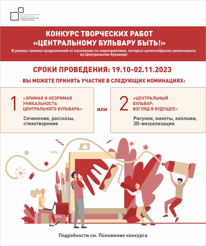 Приглашаем школьников города принять участие в конкурсе по двум номинациям: «Зримая и незримая уникальность Центрального бульвара» и «Центральный бульвар: взгляд в будущее». Прием работ проводится с 19 октября по 2 ноября 2023 года.