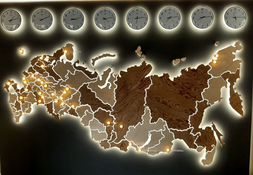 В одном из залов «Атома» представлена огромная карта страны Росатом, выполненная из дерева. На ней выделены 30 атомных городов, среди которых есть и Краснокаменск.