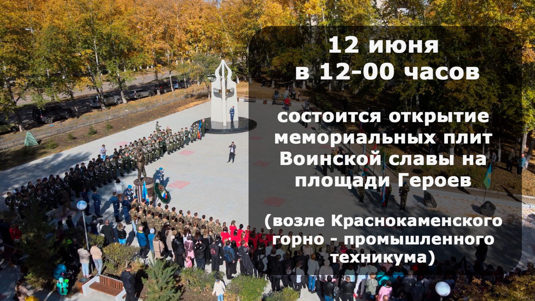 Уважаемые Краснокаменцы! В День России приглашаем вас на площадь Героев. 12 июня в 12.00 часов состоится открытие мемориальных плит Воинской славы.