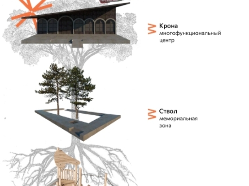 Рядом будет располагаться мемориальная зона, представляющая собой символический ствол дерева. Здесь размещен памятник Великой Отечественной войне и проектируется мемориал, посвященный локальным конфликтам в России. Он имеет особую символику, отражающую память о прошлых событиях. Форма самого монумента разрабатывается художниками-монументалистами.