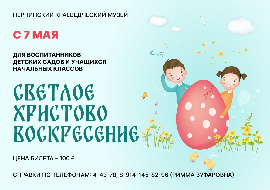 По доброй традиции Нерчинский краеведческий музей приглашает воспитанников детских садов и учащихся начальных классов на праздник «Светлое Христово Воскресение» – главный церковный праздник всех православных христиан. Отмечая этот праздник, мы приобщаем наших детей к истокам православной русской культуры. С 7 и 8 мая принимаем заявки и ждем всех на мероприятие. Так же, как и много веков назад, мы отметим этот праздник колокольным звоном, музыкой, песнями и веселыми народными играми.