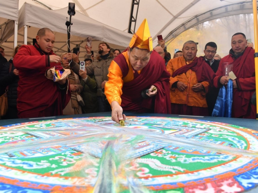 Фото Ивана Макеева, «Комсомольская правда», пресс-службы Московского буддийского центра «Легшед Даржалинг» Разбор Мандалы стал завершающим мероприятием недели буддийской культуры «Дни добра и милосердия», который прошел с 9 по 22 октября. Именно в эти дни сложнейшая мандала из песка и драгоценных камней была возведена священнослужителями. Она изображает дворец, в центре которого находится Будда Медицины, дарующий здоровье всем живым существам. Мандала исцеляет от болезней, дарит долголетие. В наше время это особенно важно тем, кто находится в зоне СВО или вернулся оттуда из-за болезни или ранений.