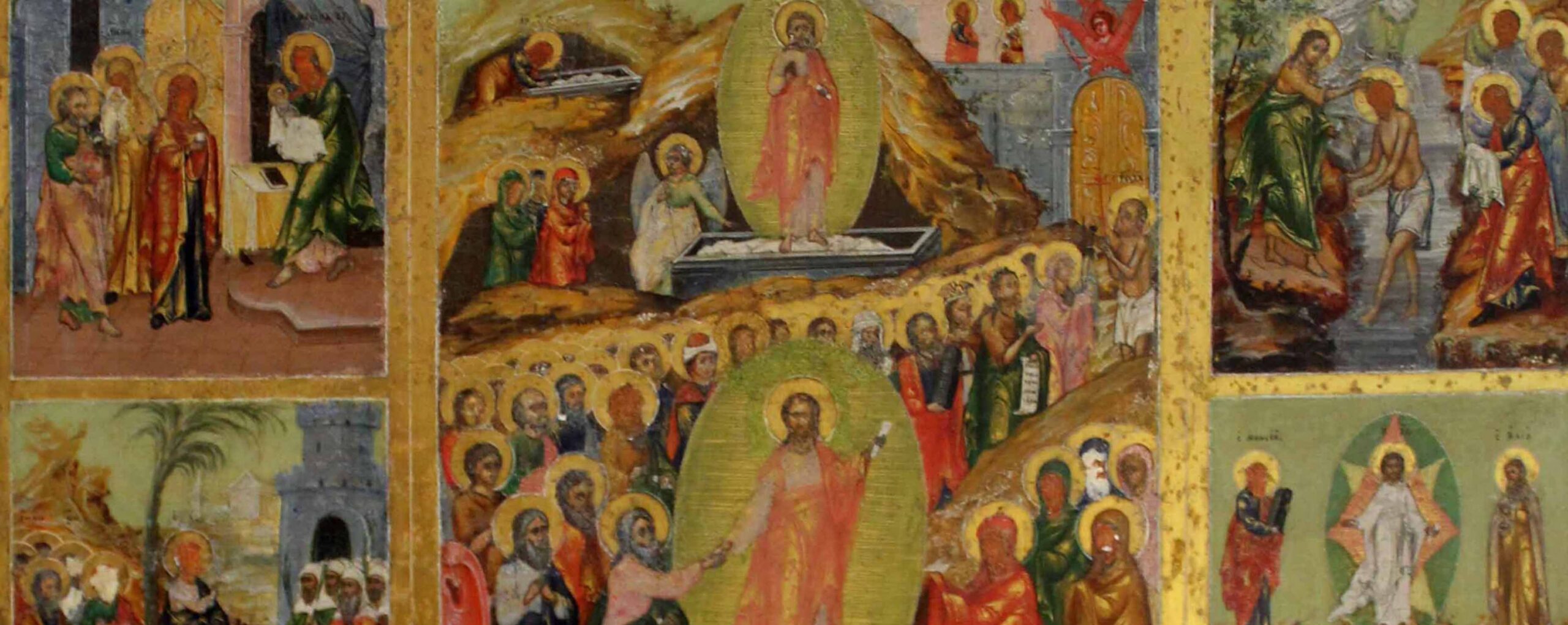 Среди икон, представленных на выставке «Святые воины» , присутствует Воскресение Христово как символ того, что мирские и духовные брани завершаются победой. В центре иконы – многосюжетность Воскресения. Это Сошествие Господа в ад – первый день Воскресения, когда Он в Рай поднял праведников, ожидавших Его пришествия со времён Адама. Во-вторых, изображение Воскресшего Христа в белом хитоне и красной гиматии в мандорле над гробом. В-третьих, явление Ангела женам-мироносицам и обнаружение апостолами пустого гроба.
