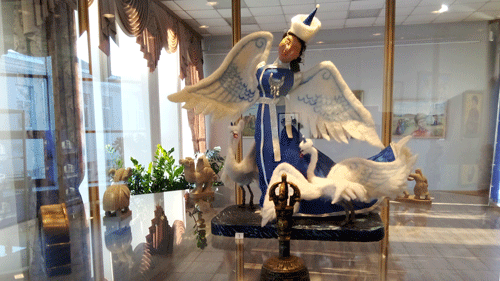 Валентина Мировая, выпускница факультета культуры и искусств ЗабГУ, она имеет свою гончарную студию, проводит мастер-классы. Часть своих работ экспонирует в нашем музее. Одна её работа называется «Дух Байкала». Также представлена сюжетная композиция по мотивам алтайской сказки «Белый цветок». На большой витрине у нас представлена композиция предметов декоративно-прикладного искусства. Это обязательные атрибуты костюмов, украшений, курильники, колокольчики, очир и многое другое.