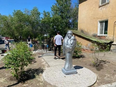 Статую жены декабриста с ребенком на руках установили в сквере с беседкой, дорожками и фонарями возле музея «Церковь декабристов» в Чите.