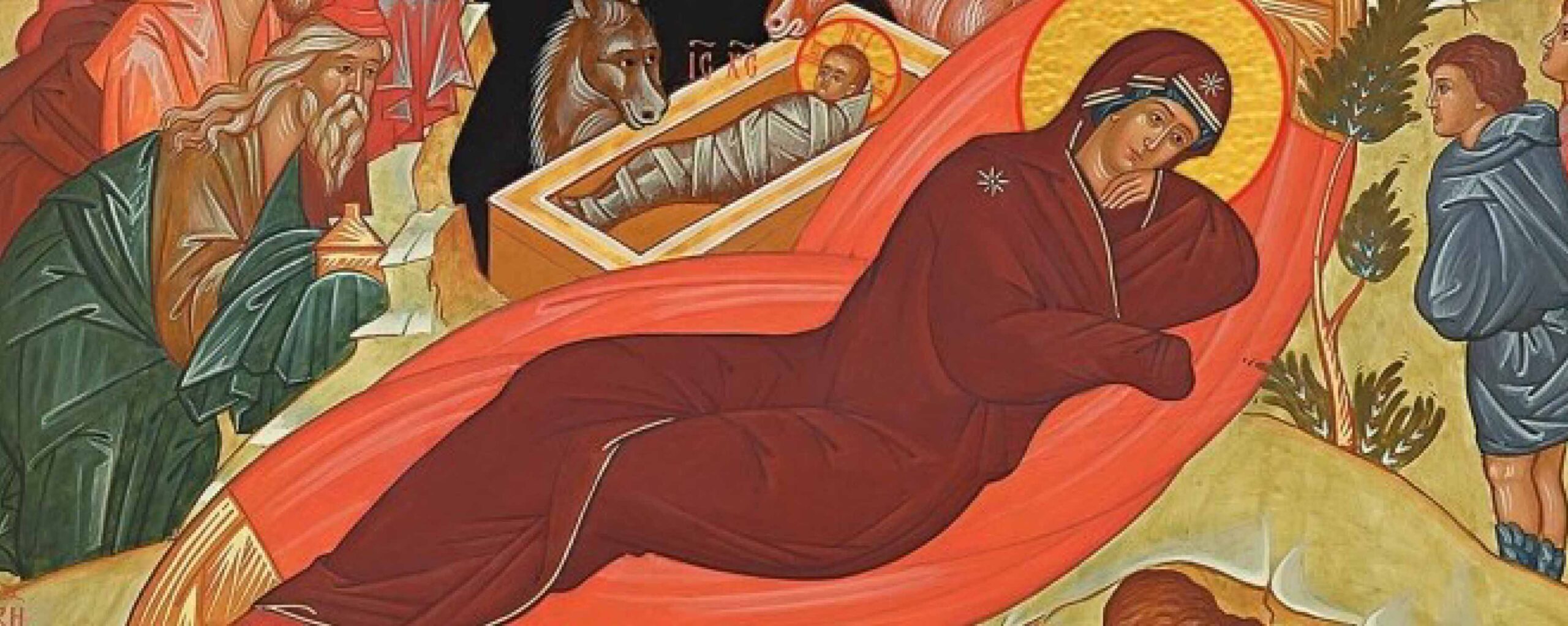Умело художник представил и серп луны – второе светило, ставшее дорогой для волхвов, т.к. именно ночью они шли и ночью Христос родился. Согласно Евангелию, Христос родился в пещере для скота и был положен в ясли. Своим дыханием животные Его обогрели.