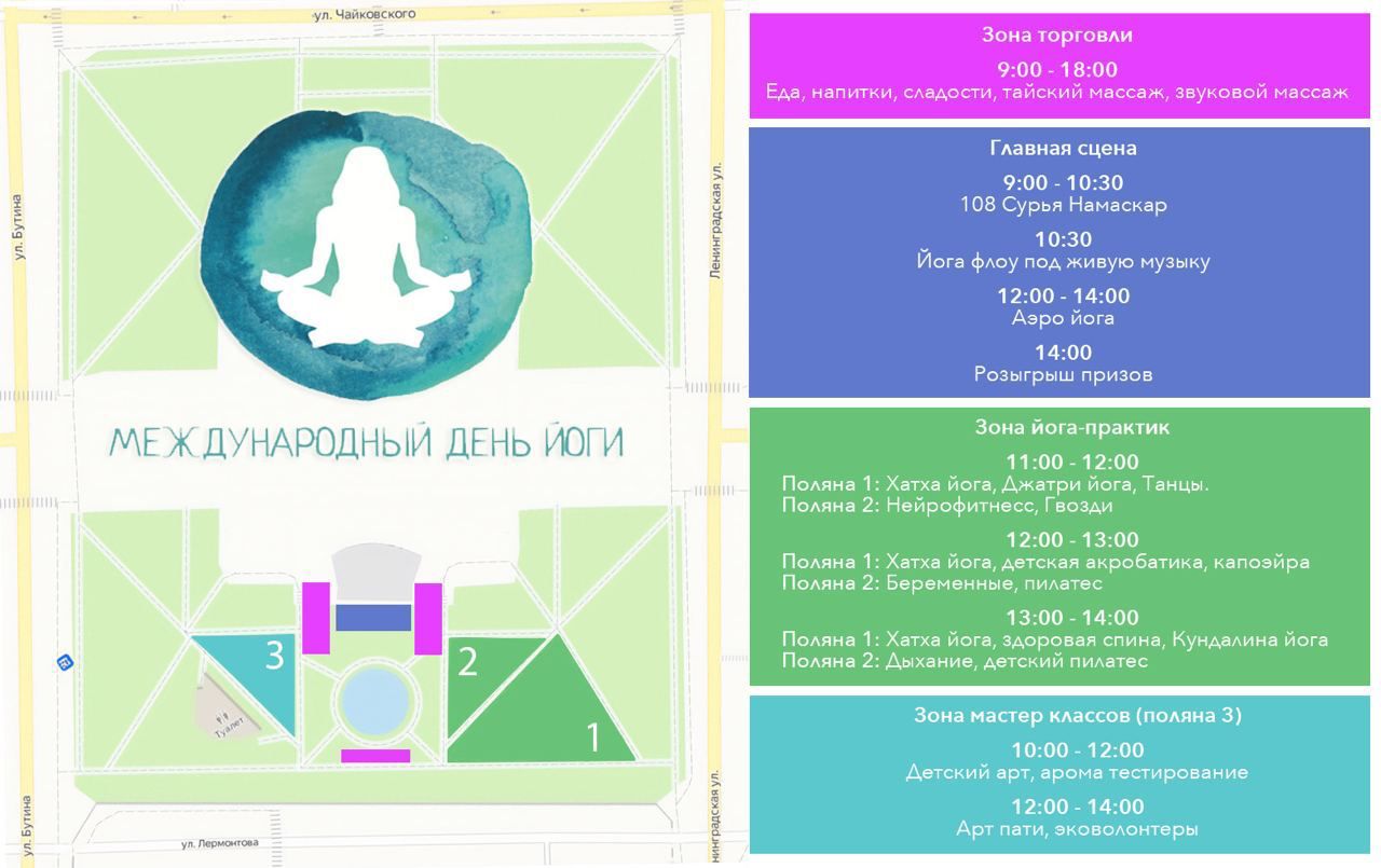 11.00 — йога и практики: хатха-йога, практика инь-йоги с Ксенией Воловиковой; джатри-йога (медитативный танец) и пение мантр со Степаном Беловым; танцевальный мастер-класс с Татьяной Филипповой; нейрофитнес и дорожка на гвоздях с Анной Горской под звуки глюкофона.